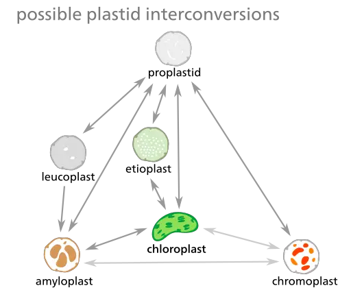 Chloroplasts can give rise to other plastids including chromoplasts, gerontoplasts, and leucoplasts (tannosome). These plastids can transform back into chloroplasts. This is an important characteristic that allows the chloroplast (and thus the plant) to adjust or prepare for various processes.