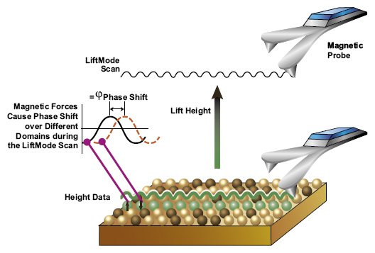 During the second phase of scanning, the tip moves along the marked trajectory above the surface (no contact). This ensures that the tip is only affected by other forces (magnetic and to a lesser extent by Van der Waal) rather than contact force. During the second phase of scanning, oscillations of the cantilever are largely due to the effects of the magnetic forces (stray fields) from the sample.